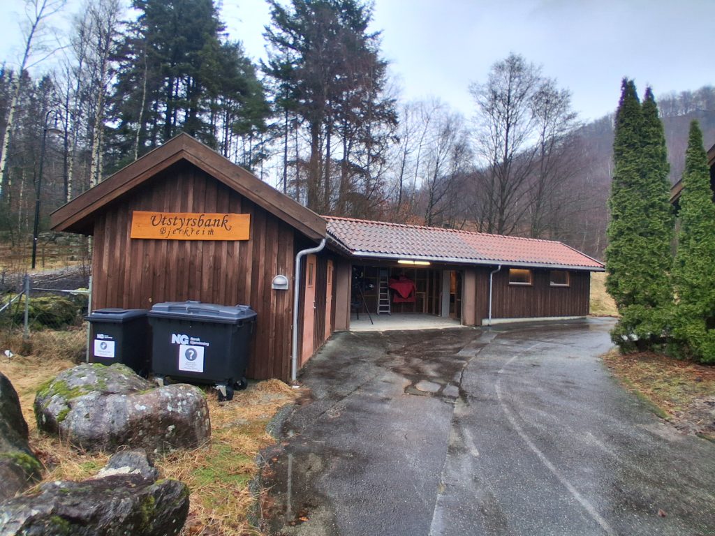 Rett bak Skjeraberget folkehelsehus ligger utstyrsbanken. Inngang på borterste kortside. Der finner du nøkkelboksen til høyre for døren.